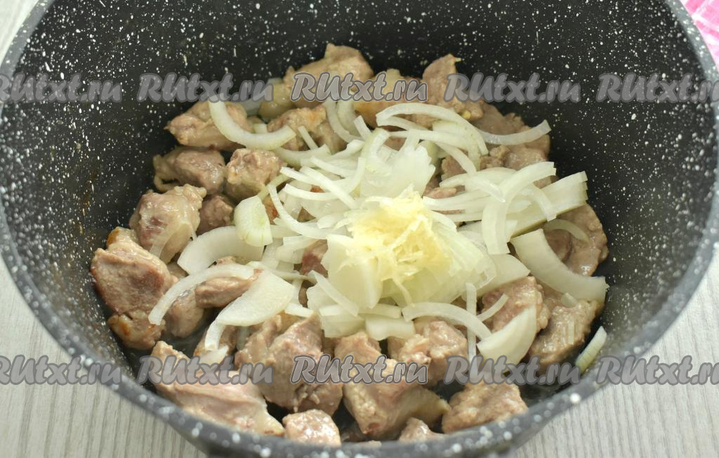 Лук очищаем, нарезаем на тонкие полукольца. Чеснок очищаем, нарезаем мелко. К обжаренной свинине добавляем нарезанные лук и чеснок, перемешиваем, убавляем огонь до среднего, обжариваем 3-4 минуты, иногда перемешивая.
