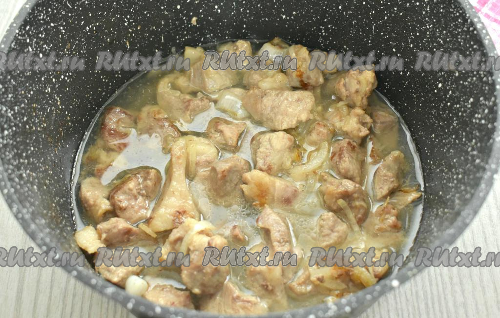 Затем к свинине вливаем примерно 150 миллилитров воды. После закипания воды тушим кусочки свинины 15 минут на небольшом огне.