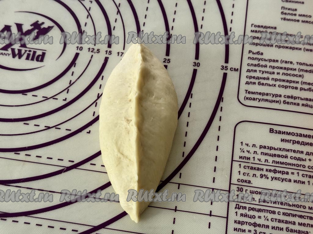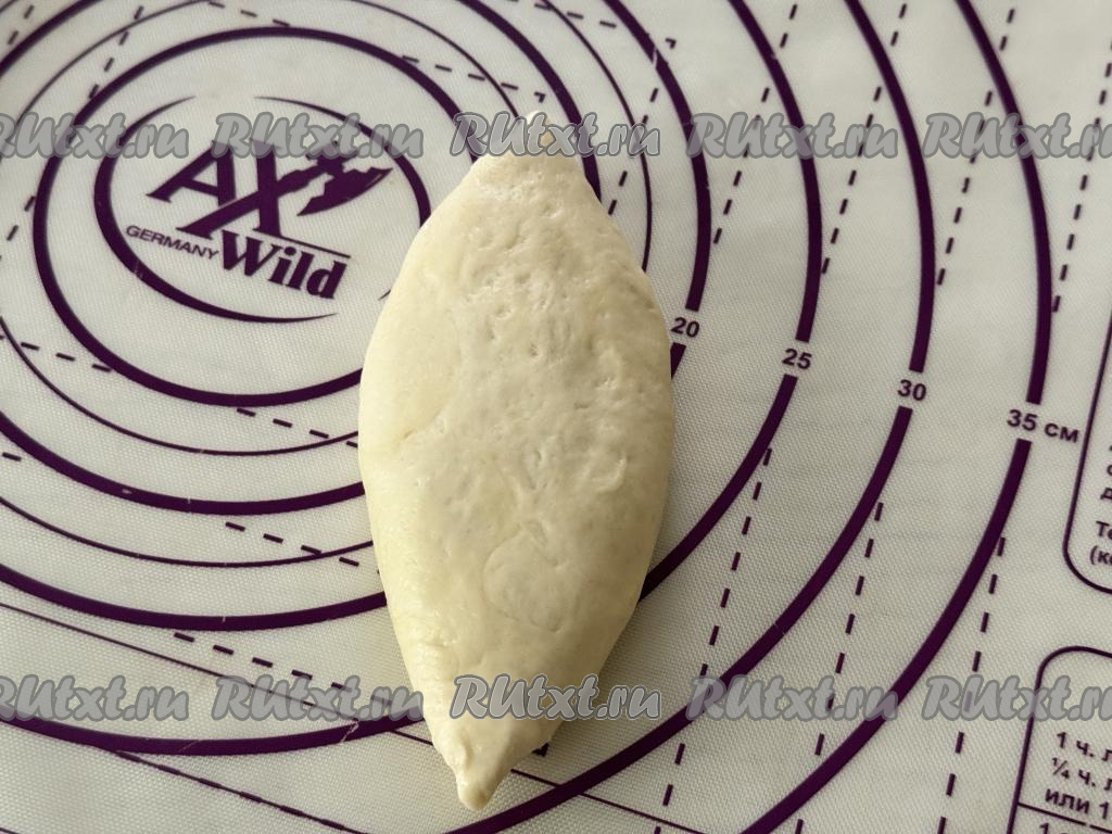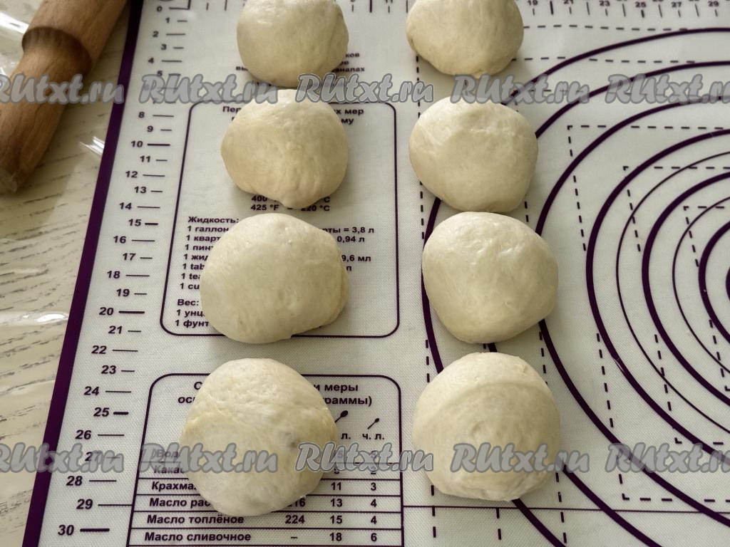 По прошествии 1,5 часов тесто хорошо поднимется, увеличившись в объёме раза в 2-3. Обмять поднявшееся тесто, разделить на 8 равных частей. Каждую часть теста скатать в шар.