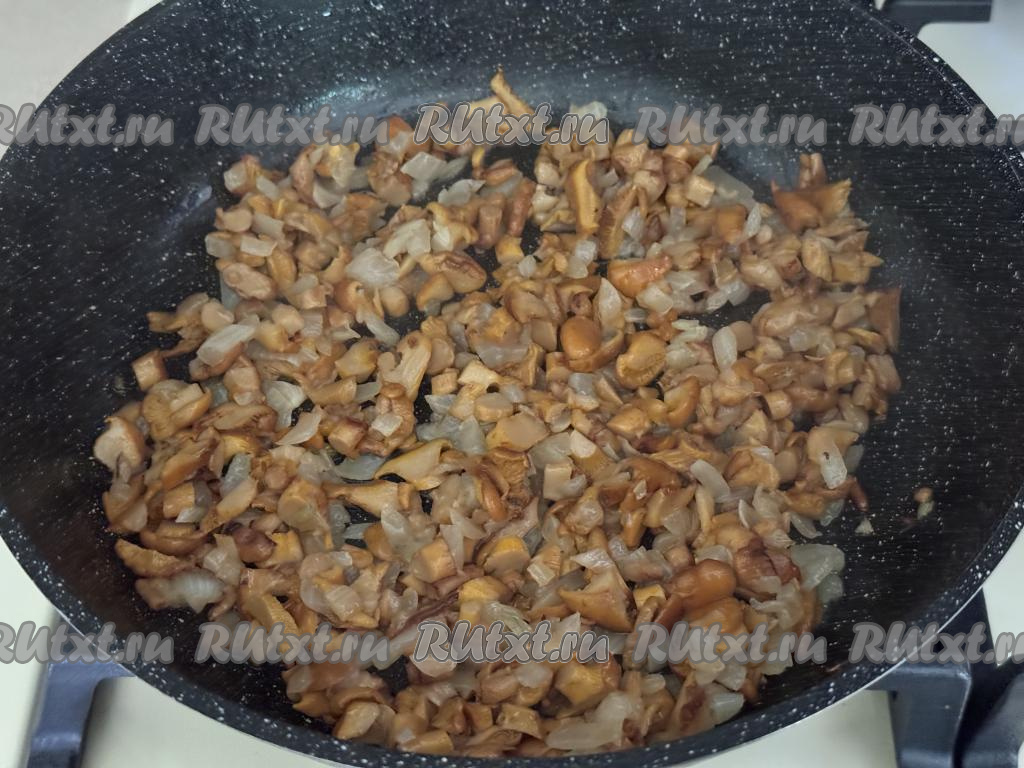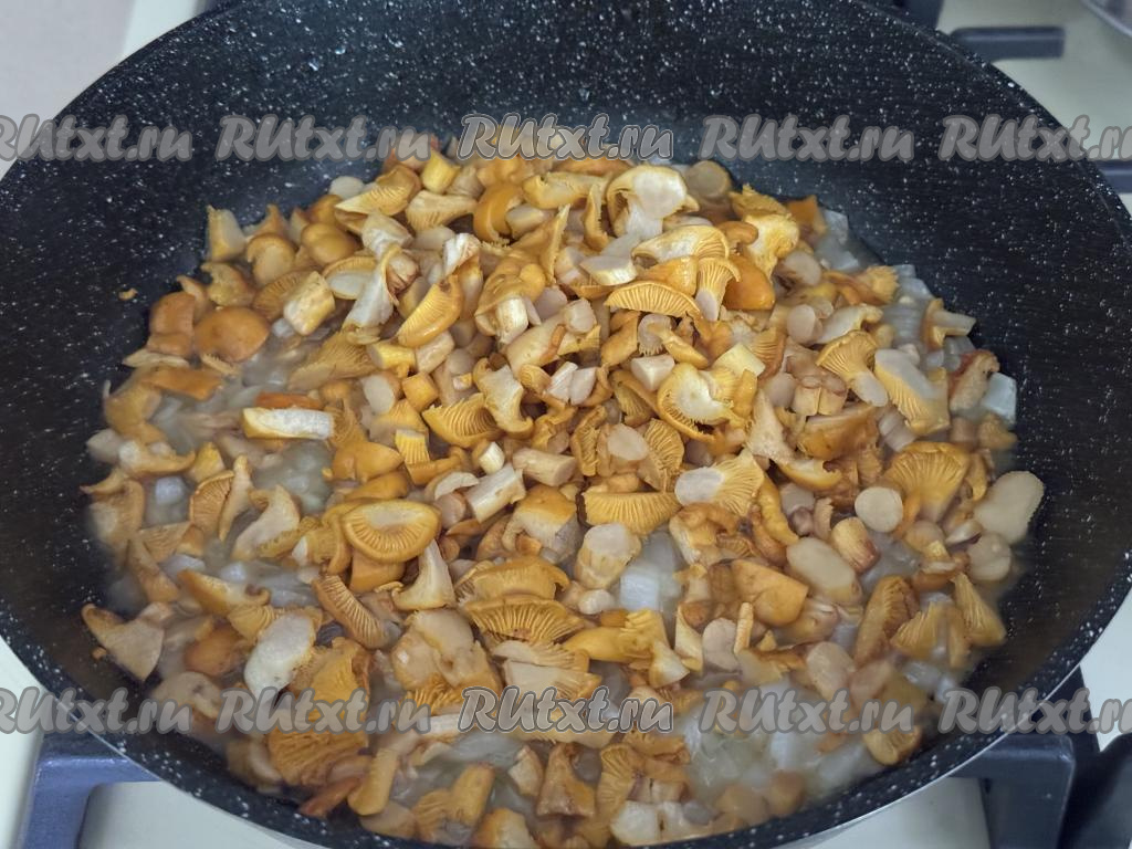 Обжаривать лисички с луком минут 20 (до полного испарения влаги и готовности грибов), время от времени перемешивая.