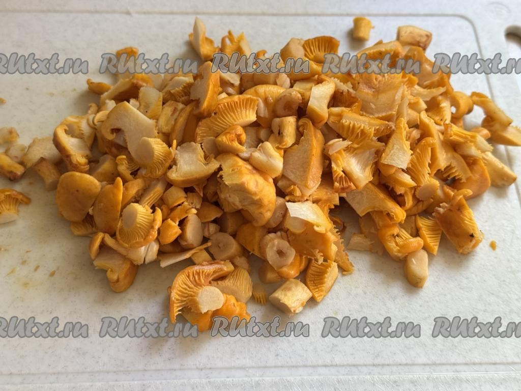 Ну а пока отваривается картошка, займёмся грибами. В этот раз я готовила пирожки со свежими лисичками. Грибы нужно тщательно промыть водой, удаляя землю и траву, лишней воде дать стечь. Нарезать лисички на средние кусочки. Если у вас замороженные лисички, тогда их можно не размораживать.