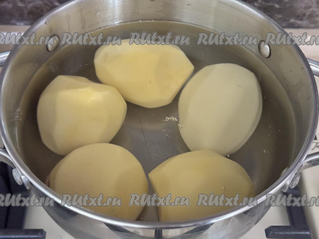 Пока тесто поднимается, нужно приготовить начинку из картофеля и лисичек для пирожков. Очищенную картошку нужно отварить в подсоленной воде до готовности (ориентировочно в течение 20-25 минут с момента закипания воды, готовые картошины будут легко прокалываться ножом).