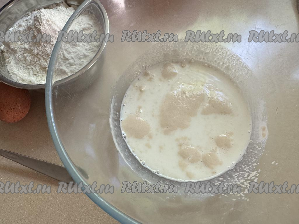 Сперва разведём опару. Для этого нужно подогреть молоко на плите (или в микроволновке) примерно до 38 градусов. Тёплое молоко влить в объёмную миску, добавить сухие дрожжи и сахар, тщательно перемешать и оставить в тёплом месте минут на 15. По прошествии 15 минут на молочно-доржжевой поверхности появится пенная шапочка, это говорит о том, что дрожжи начали работать, значит опара готова и можно приступать к замешиванию теста.