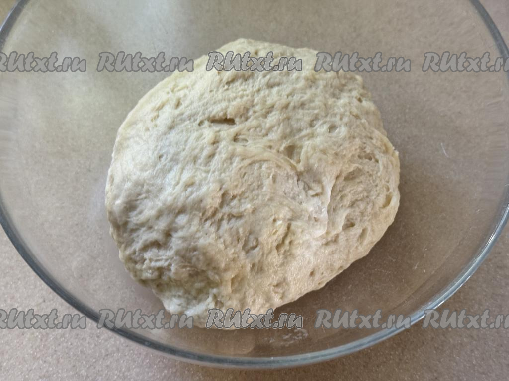 Постепенно подсыпая оставшуюся муку, вымесить тесто руками до гладкого состояния. В общей сложности вымешить руками тесто нужно минут 7. Добавляя муку и вмешивая её, учитывайте, что тесто должно получиться мягким, практически не липнущим к рукам. Оставить колобок из теста в миске, накрыть пищевой плёнкой (или полотенцем), поставить в тёплое место часа на 1,5 (до увеличения в объёме в 2-3 раза).