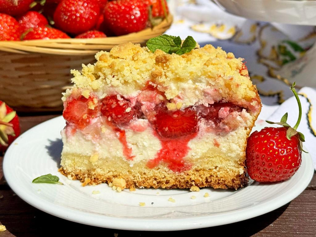 А вот как аппетитная королевская ватрушка выглядит в разрезе. Вкуснейший творожный слой с ягодами клубники в сочетании с песочной основой делает этот пирог очень нежным, он просто тает во рту.
