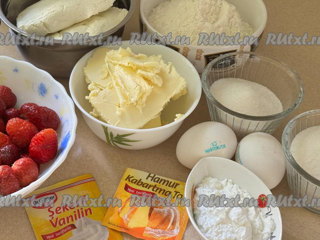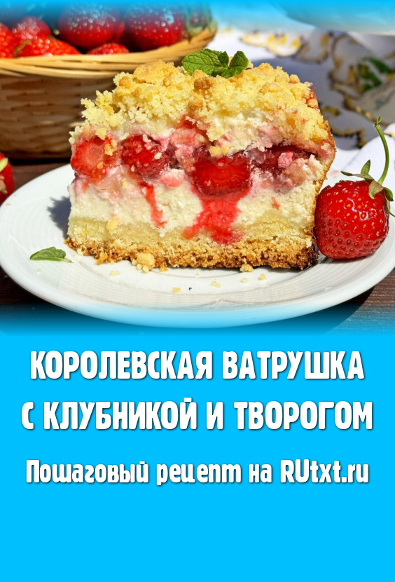 Королевскую ватрушку с клубникой и творогом выпекать в разогретой до 180 градусов духовке минут 50.
