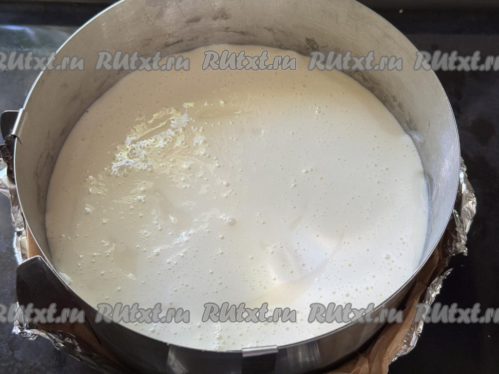 Я в качестве формы для выпечки использовала кулинарное кольцо диаметром 22 сантиметра, сформировав дно из пергамента и фольги, сложенных в 2 слоя.