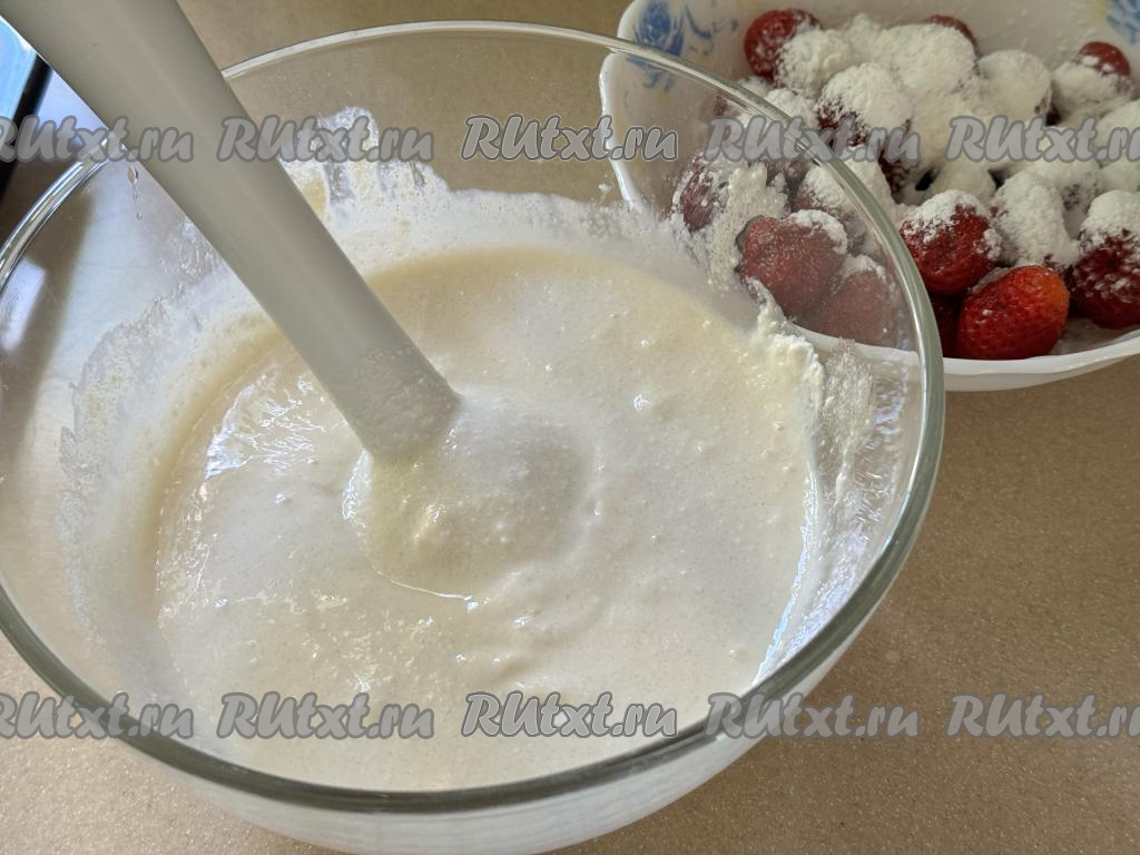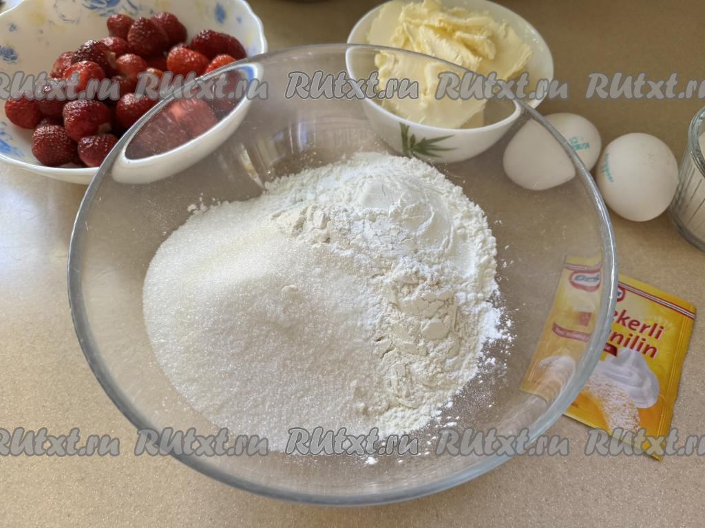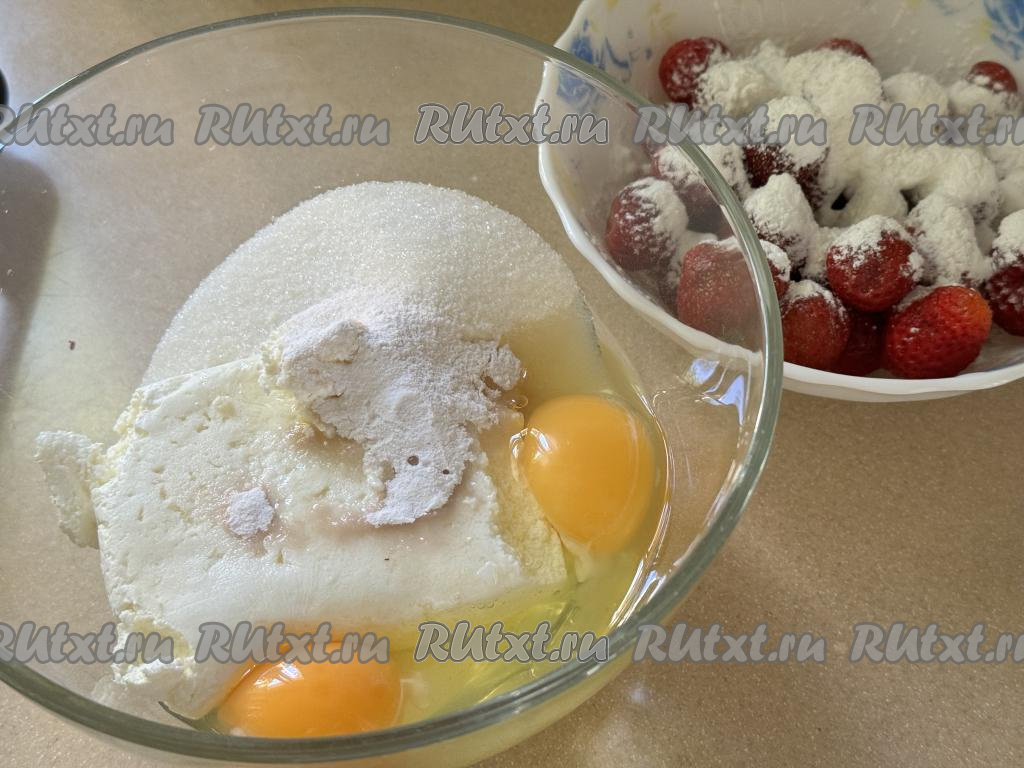 Для приготовления начинки нужно в объёмной миске соединить творог, сырые яйца, сахар и ванильный сахар. В глубокую тарелку выложить 300 грамм подготовленной свежей (или замороженной) клубники, всыпать муку, аккуратно перемешать, обваливая ягоды в муке со всех сторон.