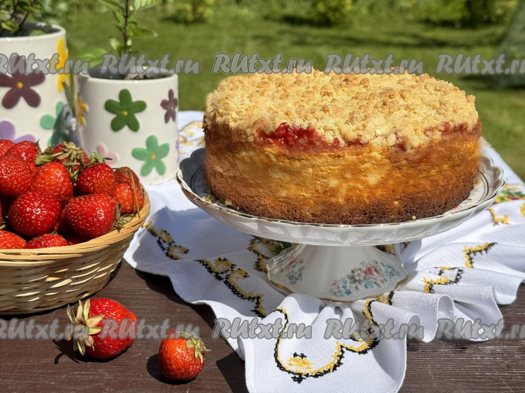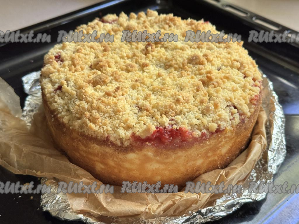 Равномерно разложить отложенную ранее песочную крошку поверх творожно-клубничного слоя.
