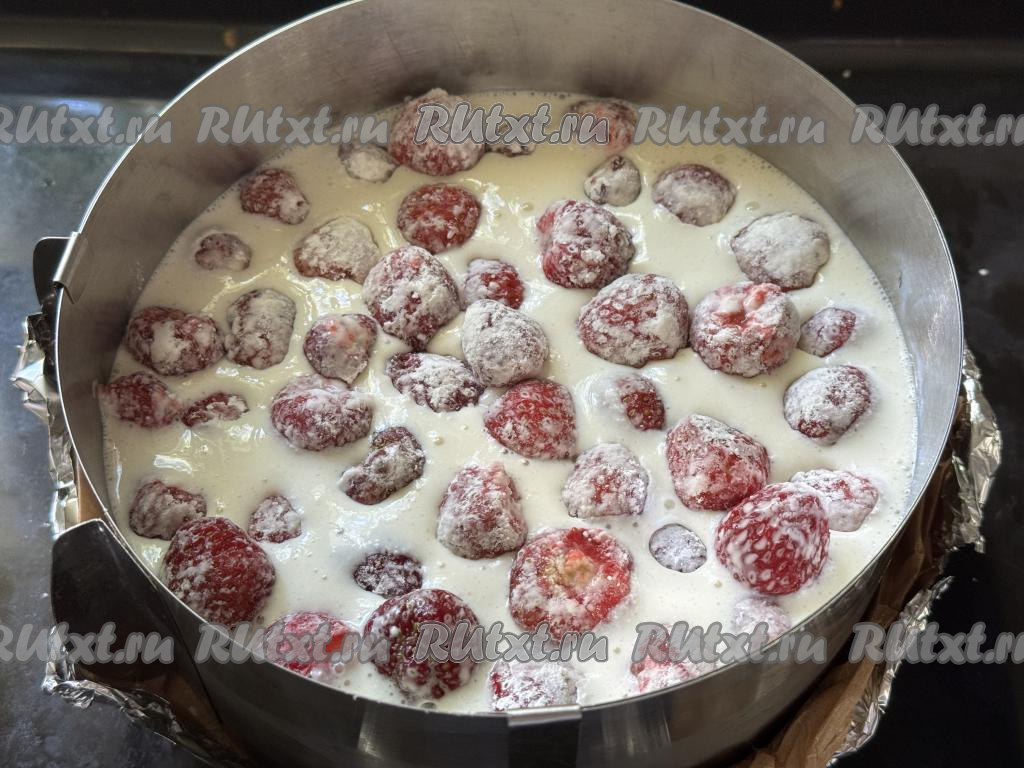 Затем на творожный слой разложить клубнику, слегка утапливая её в начинку.