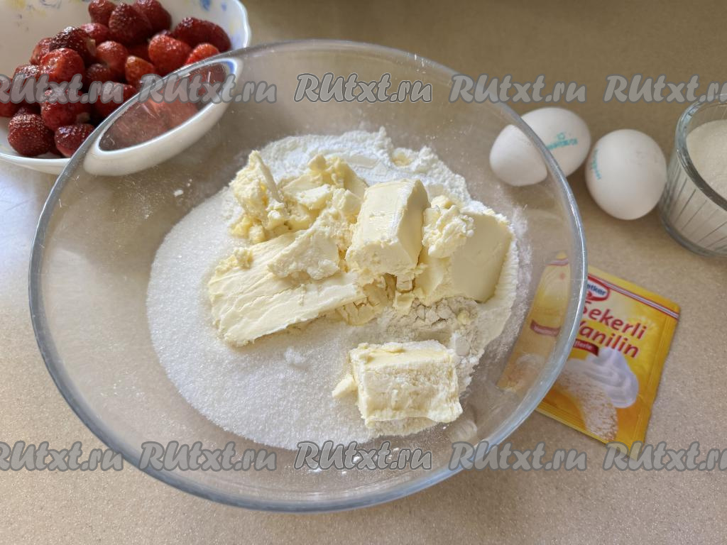 Достать из холодильника сливочное масло, сразу нарезать его на небольшие кусочки, выложить в миску с мукой.