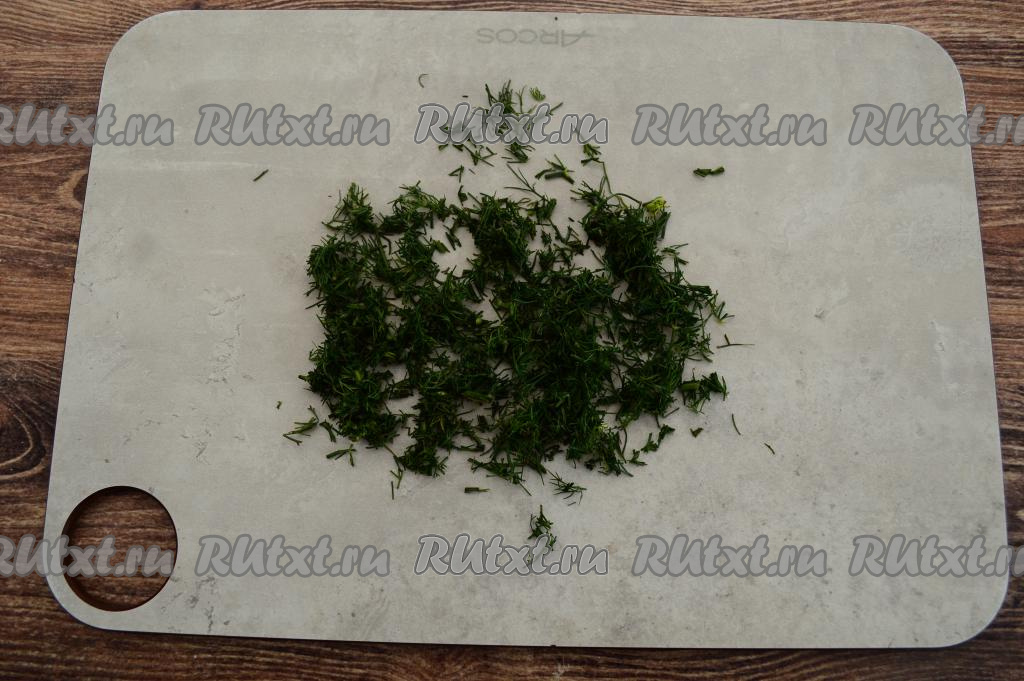 Пока кабачок, смешанный с солью, "отдыхает", займёмся укропом. Для этого нужно укроп промыть водой, обсушить, удалить крупные веточки, нарезать достаточно мелко.