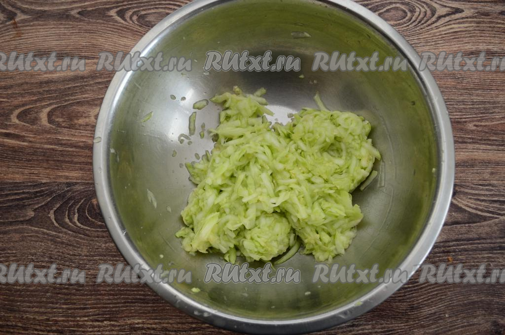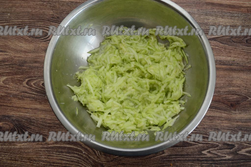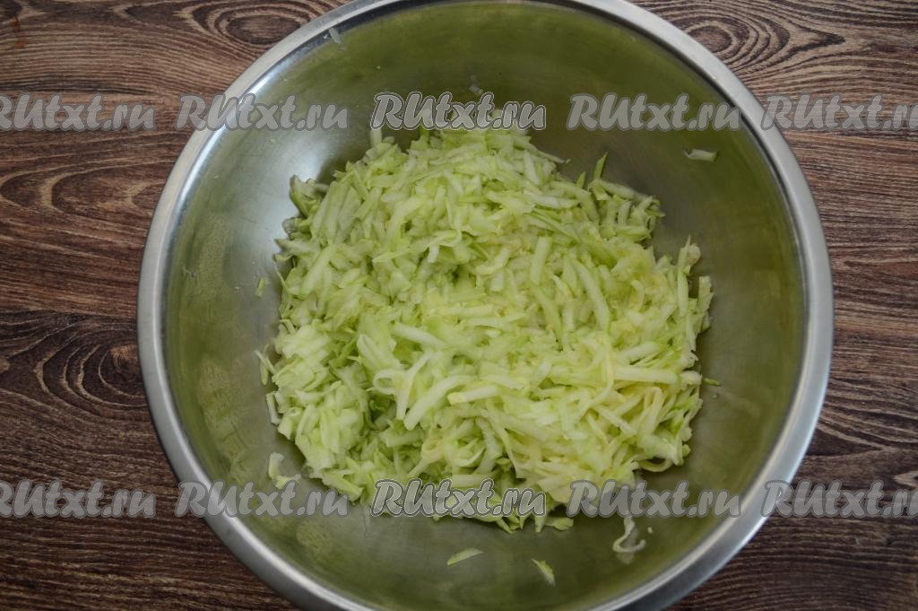 Кабачок я взяла молодой, то есть с мелкими семечками. Такой кабачок нужно просто очистить от кожуры, отрезав предварительно кончики с двух сторон. Если же вы возьмёте кабачок с крупными семечками, тогда нужно будет очистить кабачок от кожуры, удалить семечки. Для приготовления оладий потребуется 500 грамм подготовленного кабачка. В глубокую миску натереть кабачок на крупной тёрке, добавить соль, хорошо перемешать и оставить на 10 минут, чтобы выделился сок из кабачка.