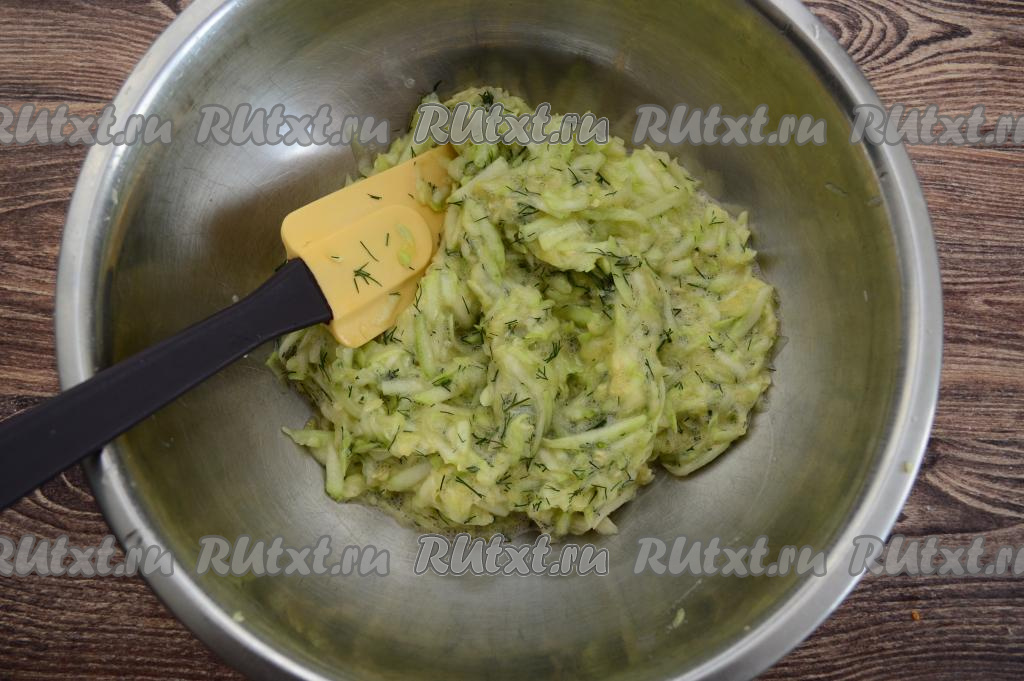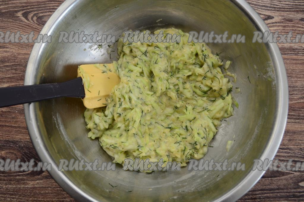 Затем всыпать примерно 1 столовую ложку муки, тщательно перемешать кабачковое тесто.