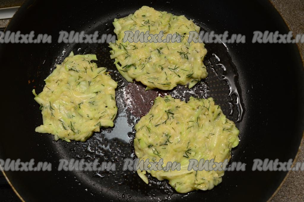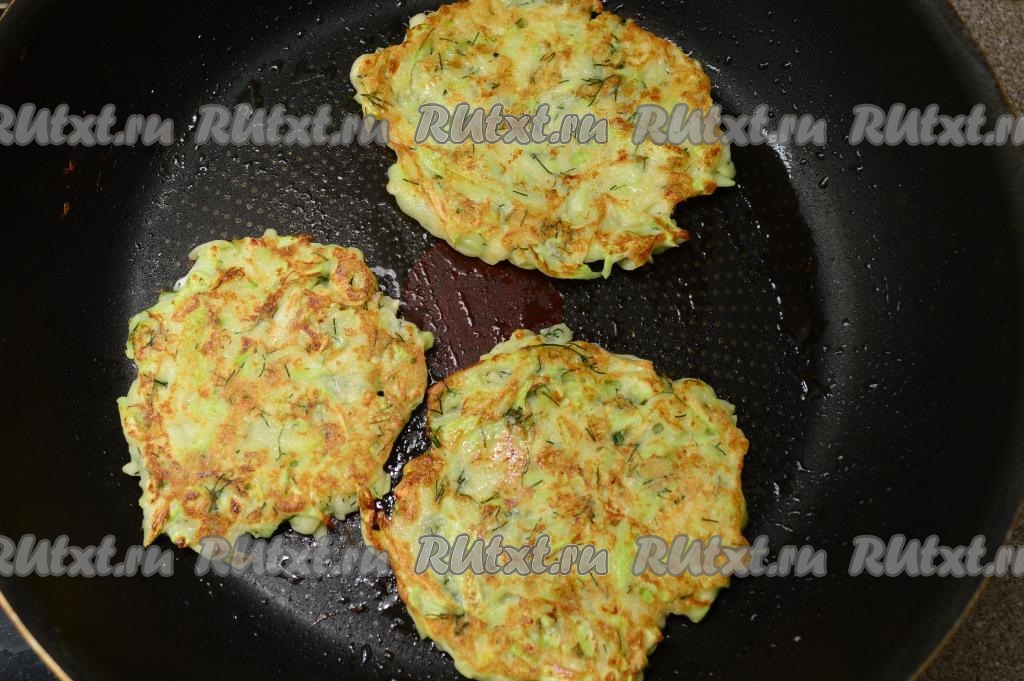 Жарить оладьи из кабачков с укропом до румяности с двух сторон (примерно по 2-4 минуты с каждой стороны) на среднем огне.