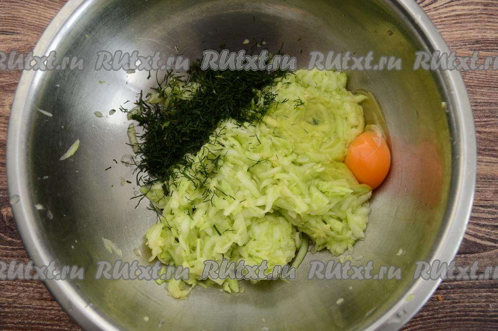 В миску с кабачком, отжатым от сока, добавить нарезанный укроп, вбить сырое яйцо.