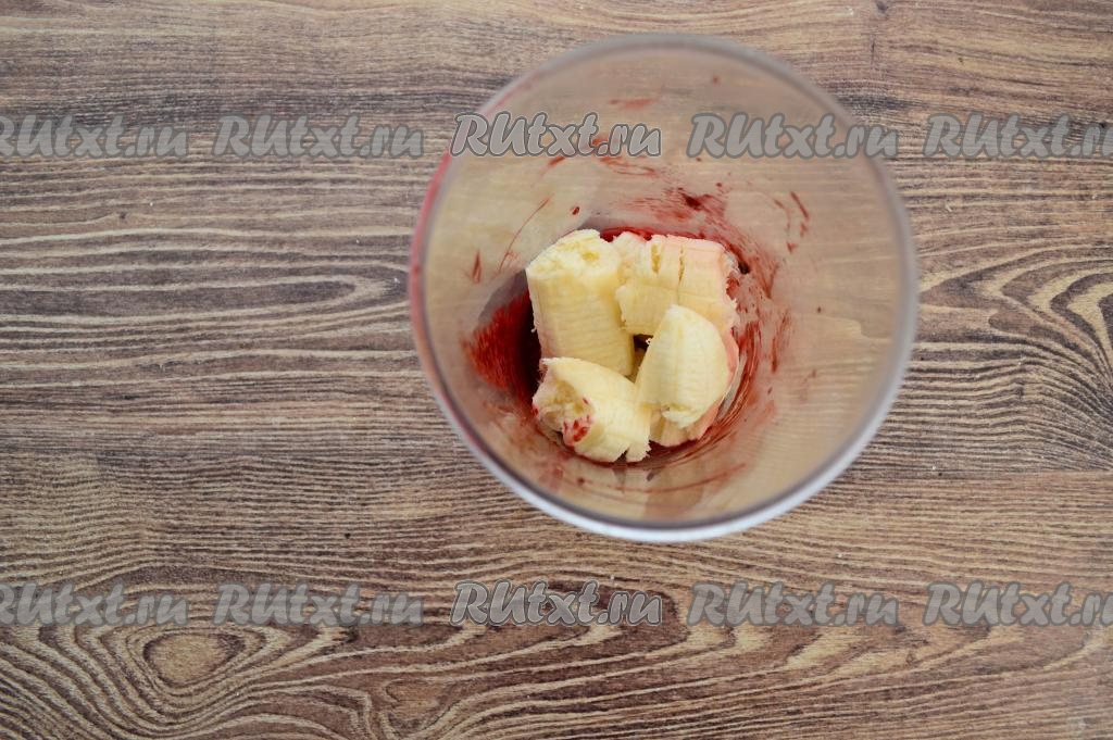 В чашу блендера выложить очищенный банан, разломанный на крупные кусочки.