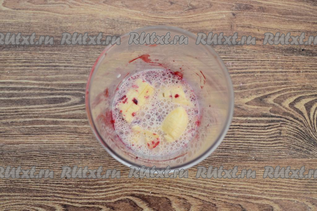Пробить смузи из ежевики и банана при помощи погружного блендера до однородности. Пробивать нужно не менее 2 минут движениями блендера вверх-вниз, чтобы кусочки банана все пюрировались и смузи стал однородным. На этом этапе нужно попробовать напиток, чтобы оценить его сладость. У меня ежевика была не очень сладкая, поэтому я добавила 2 чайных ложки сахара. Ещё раз пробить смузи блендером в течение 10-15 секунд, чтобы сахар растворился.