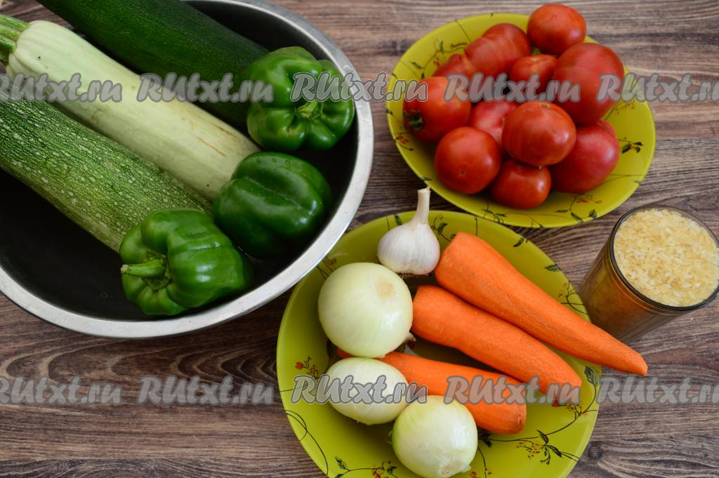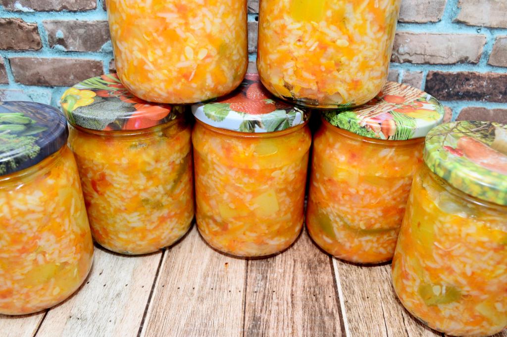 Предлагаю приготовить на зиму насыщенный, аппетитный, вкусный салат из кабачков с рисом. Рецепт заготовки несложный. В состав овощей в этом блюде, помимо кабачков, входят морковка, лук, болгарский перец, помидоры и чеснок. Все тушёные овощи отлично сочетаются с варёным рисом. Этот аппетитный, сытный салат можно подать к столу в качестве гарнира к мясу, птице или в качестве самостоятельной закуски. Мне очень нравится намазывать этот салат на хлеб, получаются наивкуснейшие бутерброды. Приготовьте салат из кабачков с рисом по этому рецепту и у вас будет отличная заготовка для холодных зимних дней!