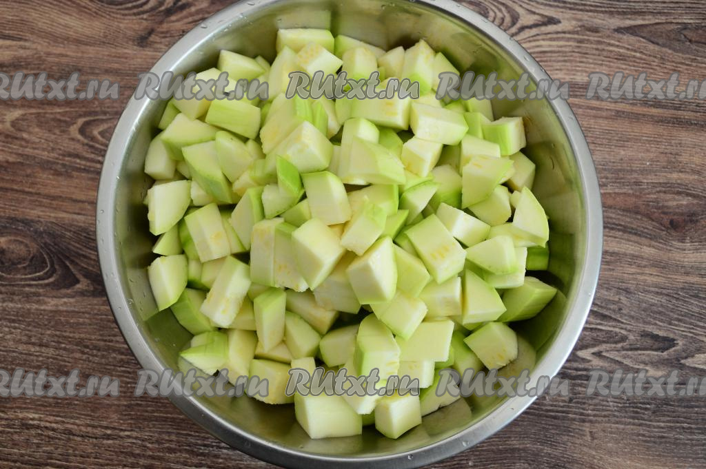 Кабачки очистить от шкурки, если семечки крупные, их тоже нужно будет удалить. У меня кабачки были с мелкими семечками, поэтому я удалять их не стала. 1,5 килограмма подготовленных кабачков нарезать на кубики с размером стороны 1,5 сантиметра.