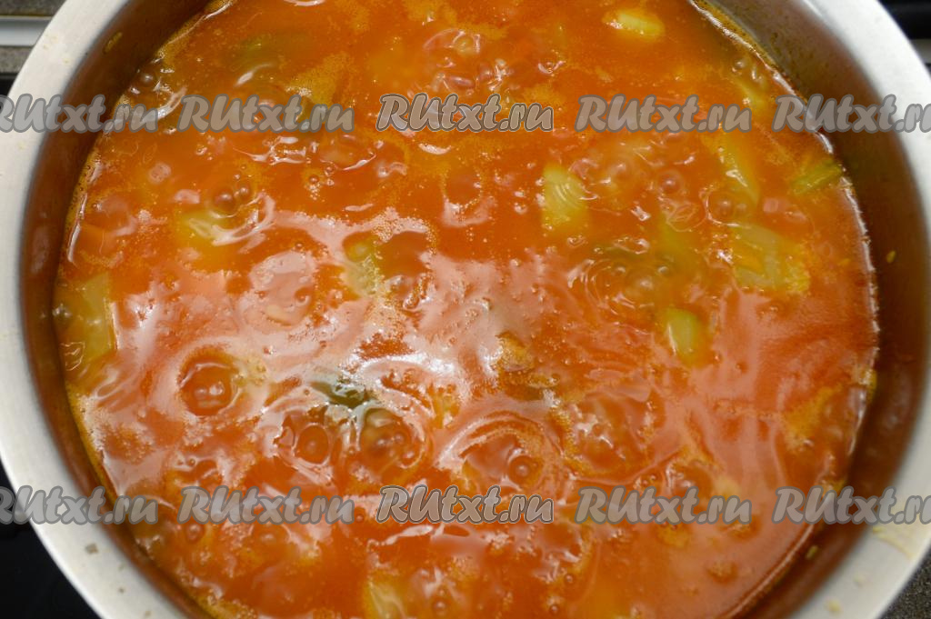 Пока овощи обжариваются, можно заняться помидорами. Помидоры вымыть, натереть на крупной тёрке так, чтобы кожура осталась в руке (кожуру можно выбросить, она нам не понадобится). Нам потребуется 700 грамм натёртых помидоров. Влить натёртые помидоры в кастрюлю с обжаренными овощами, добавить 500 миллилитров воды, всыпать соль и сахар. Перемешать, дать закипеть, после этого варить на небольшом огне 5 минут.