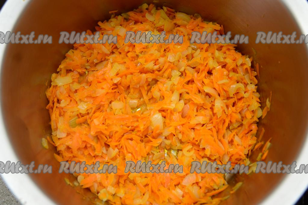 К луку, обжаренному до прозрачности, выложить морковку, натёртую на крупной тёрке, перемешать, обжарить овощи до мягкости моркови (примерно в течение 6-7 минут), время от времени перемешивая.