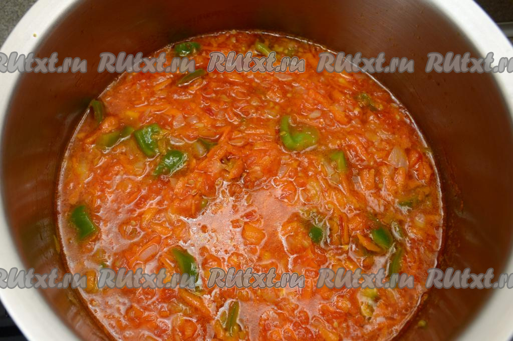 Я готовила всю заготовку сразу в кастрюле, это очень удобно. Но чтобы готовить в кастрюле, она должна быть с толстым дном (эмалированная кастрюля не подойдёт, так как в ней блюдо может подгореть). Если у вас нет кастрюли с толстым дном, тогда обжаривайте овощи в сковороде, а затем тушите их в кастрюле.