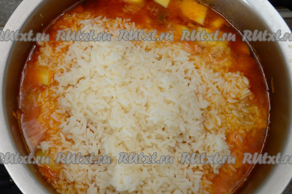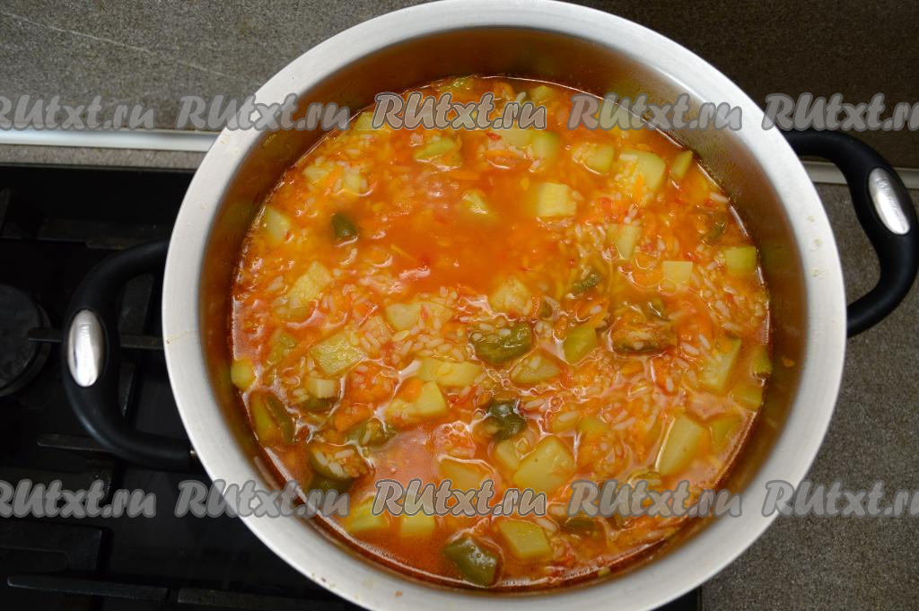 После того как кабачки с овощами протушатся 10 минут, добавить в кастрюлю рис, хорошо перемешать, дать закипеть, проварить 3-4 минуты на небольшом огне. Периодически нужно хорошо перемешивать содержимое кастрюли.