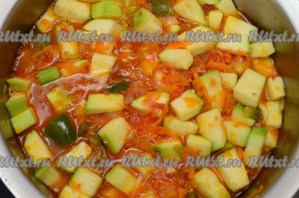 После того как овощи проварятся с помидорами 5 минут, добавить в кастрюлю чеснок и кабачки, хорошо перемешать, дать закипеть, уменьшить огонь. Варить кабачки с овощами в течение 10 минут, периодически перемешивая. Кабачки в процессе варки выделят сок, поэтому постепенно жидкости в кастрюле станет достаточно много.