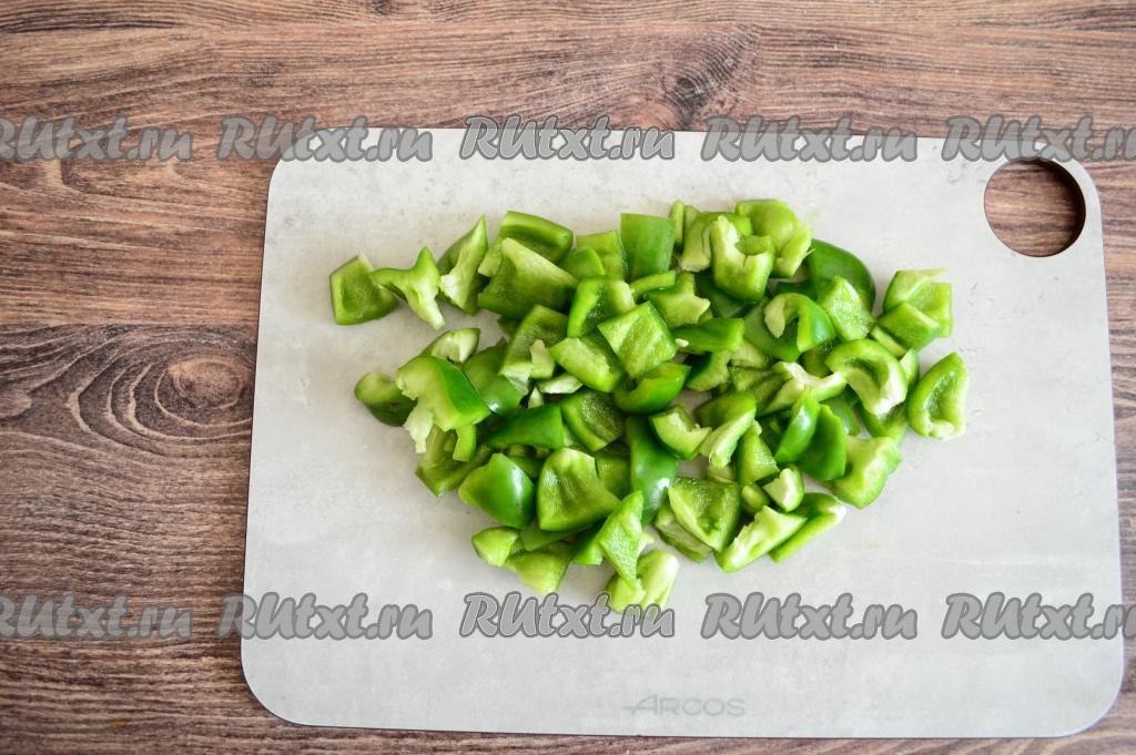 Из каждого болгарского перца удалить плодоножки с семенами. Промыть перцы водой, нарезать их на крупные кубики.