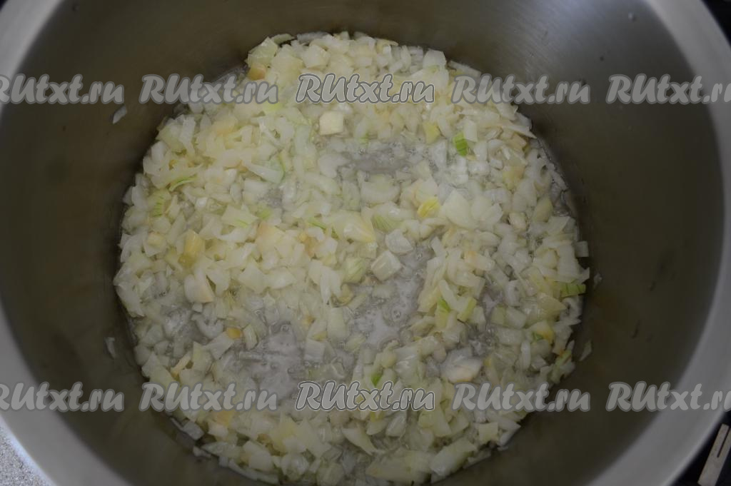 Пока отваривается рис, начинаем обжаривать овощи. Очищенный лук нужно нарезать на небольшие кубики. В кастрюлю с толстым дном объёмом не менее 4,5 литров влить 100 миллилитров растительного масла, выложить нарезанный лук, обжарить его на среднем огне до прозрачности (в течение 5-6 минут).
