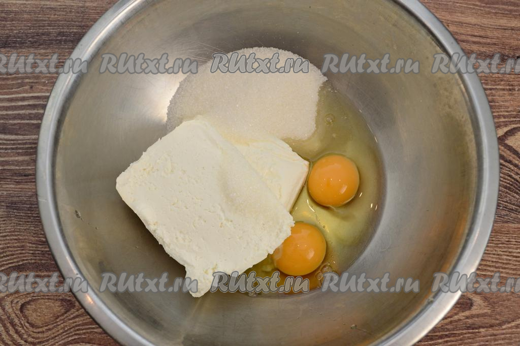В миску выложить творог, всыпать сахар, добавить сырые яйца.
