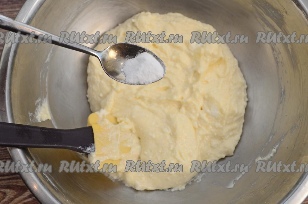 Затем всыпать соду и ещё раз перемешать творожную массу.