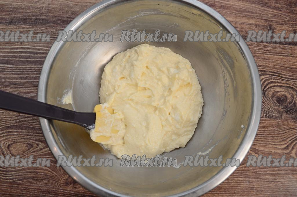 Тесто должно напоминать очень густую сметану. Оставить творожное тесто на 10-15 минут, чтобы манка успела набухнуть.