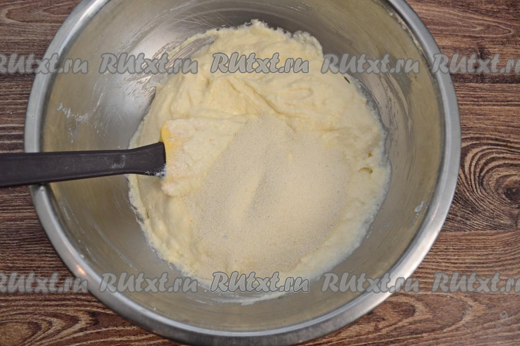 После этого в миску всыпать манку, тщательно перемешать её с творожной массой.
