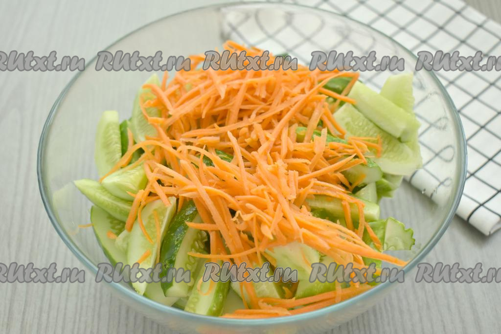 Очищенную морковь натираем на тёрке для корейской моркови (если нет такой тёрки, можно натереть морковку на крупной тёрке), выкладываем к огурцам.