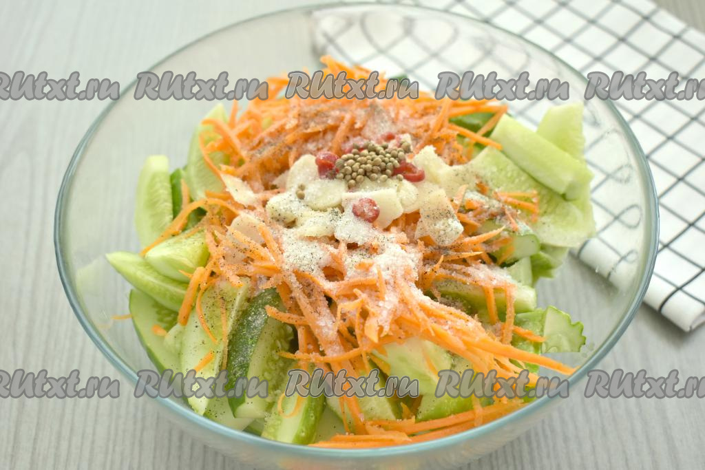 Миску с огурцами затягиваем пищевой плёнкой (или просто накрываем крышкой) и отправляем в холодильник на 5-6 часов. Через каждый час огурцы с морковкой нужно перемешивать.