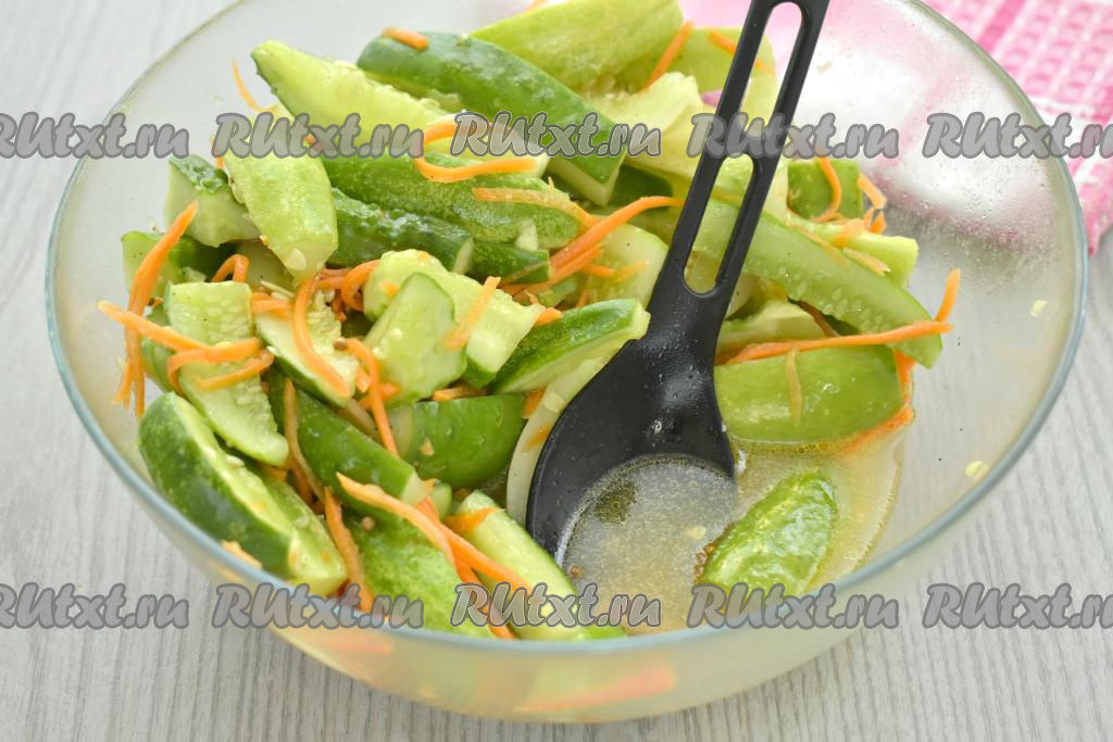 Вливаем растительное масло, хорошо перемешиваем огурцы с морковкой, чесноком и специями.