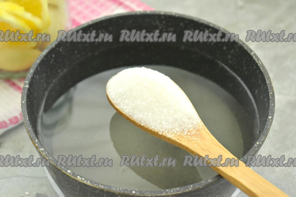 В кастрюлю с водой, слитой из банки, всыпаем сахар, перемешиваем, ставим на сильный огонь. После закипания воды с сахаром варим сироп на небольшом огне 2 минуты, чтобы сахар полностью растворился.
