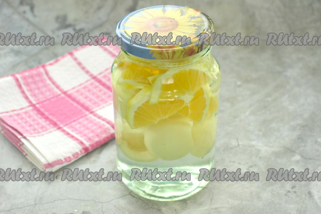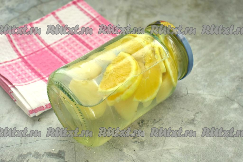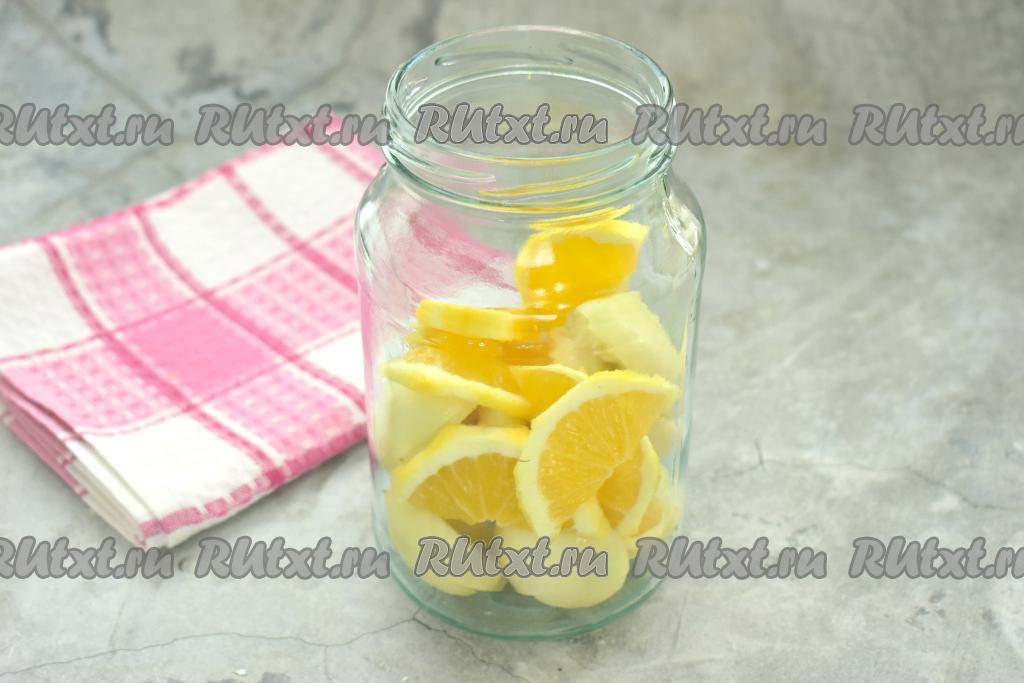 Вымытую банку объёмом 1 литр стерилизуем любым удобным способом (я обычно стерилизую банку в течение 3-4 минут над паром), кипятим крышку в течение 3 минут с момента закипания воды в кастрюле. Половинки нектарина и кружочки апельсина выкладываем в простерилизованную банку.
