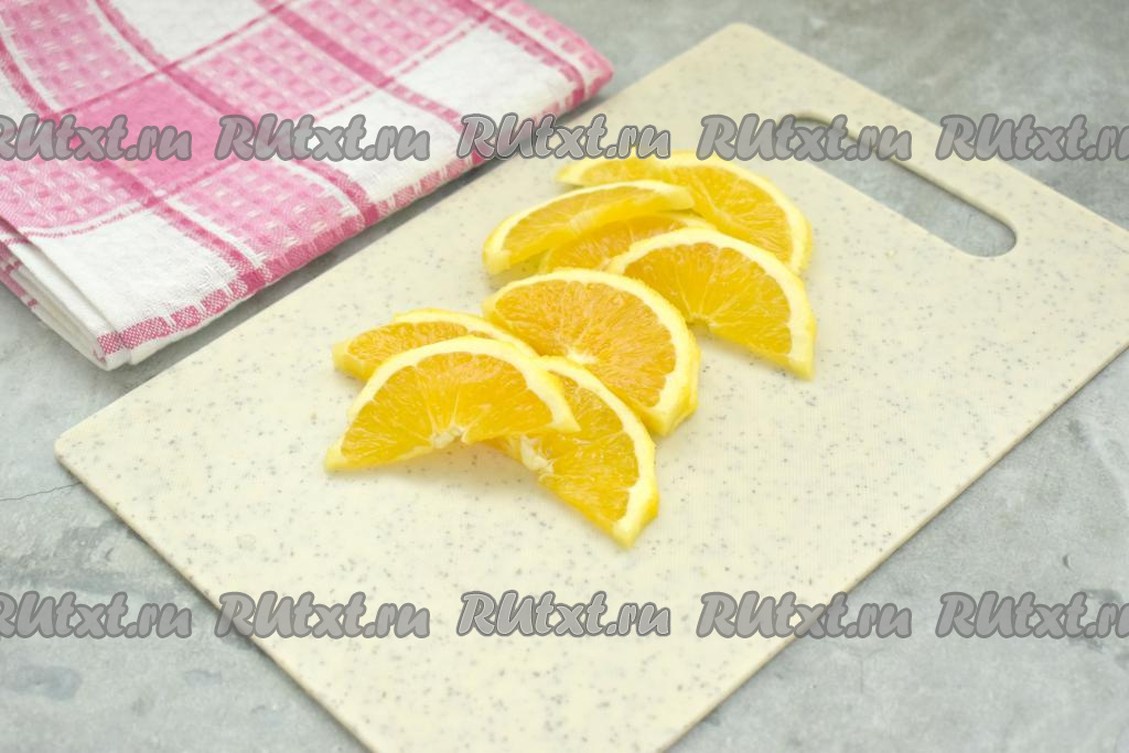 С апельсина снимаем шкурку, удаляем косточки. Нарезаем половину апельсина на полукружочки толщиной примерно 0,5 сантиметра.