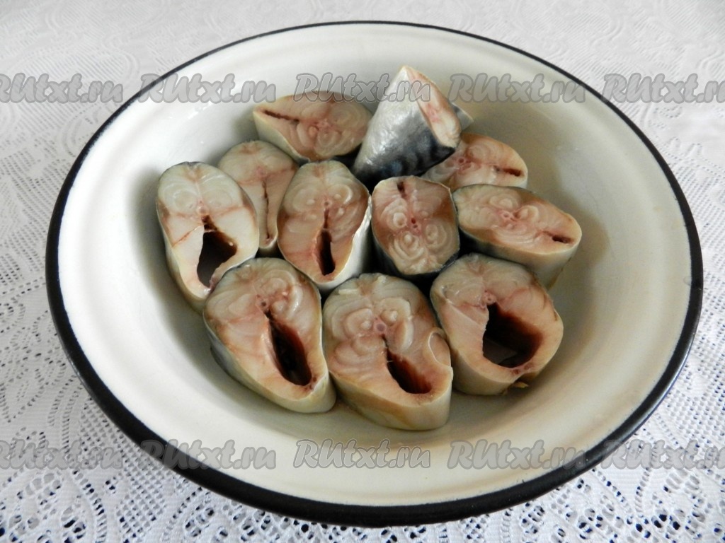 От рыбы отрезать голову, плавники и хвост, очистить от внутренностей, не разрезая живот. Разрезать на порционные кусочки шириной 1,5-2 сантиметра, вымыть, тщательно вычистив внутри.