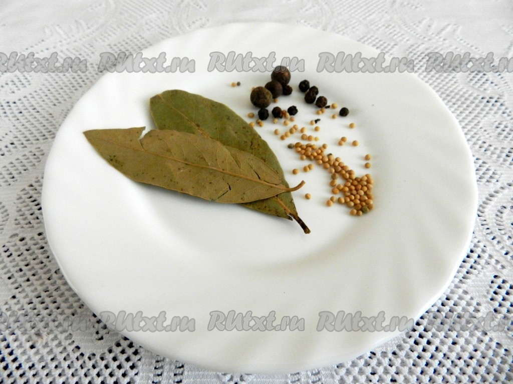 Подготовить лавровые листья, горошины чёрного и душистого перцев, зёрна горчицы для маринада.