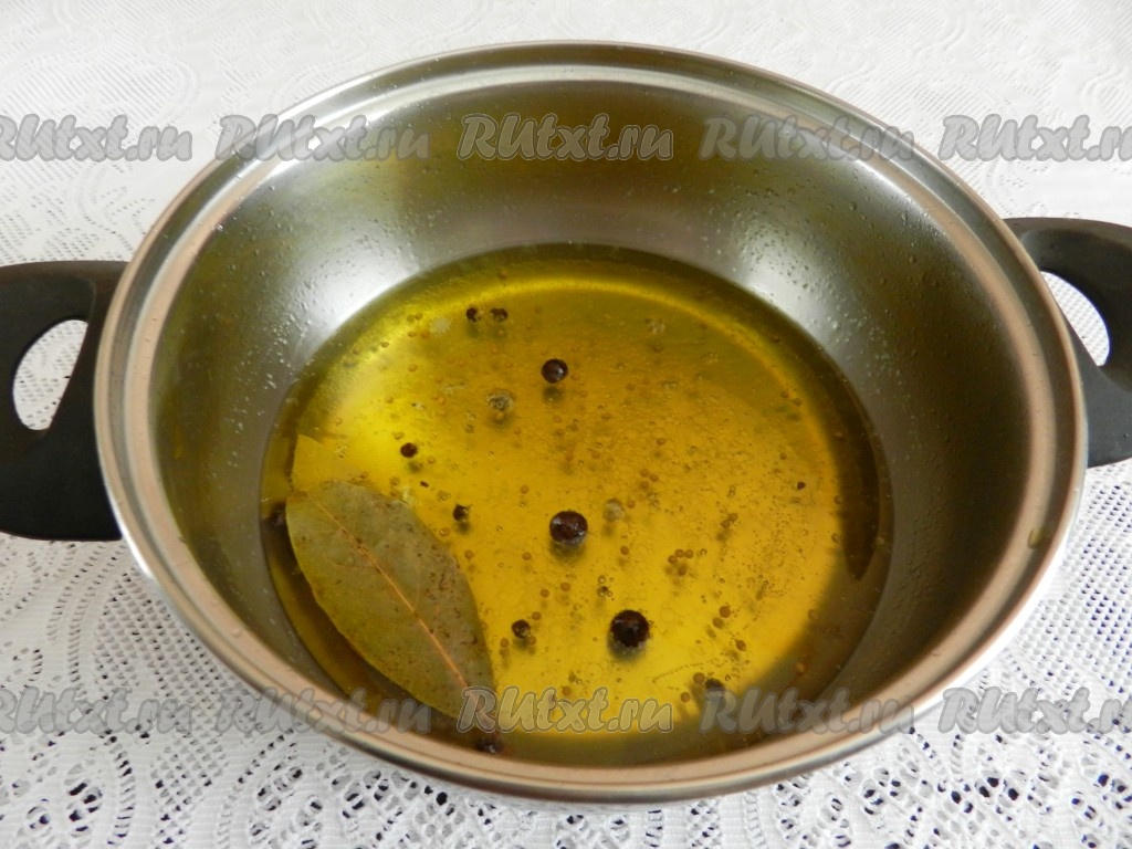 Добавить лавровые листья, горошины чёрного и душистого перцев, зёрна горчицы в маринад, дать закипеть.