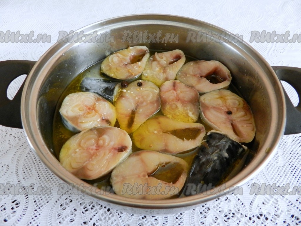 Снять закипевший маринад с огня и сразу выложить в него кусочки скумбрии, чтобы маринад полностью покрывал рыбу, поставить на огонь. Довести до кипения и варить на медленном огне под крышкой 5-6 минут. Затем убрать с огня и оставить отварную скумбрию в маринаде на 2 часа.