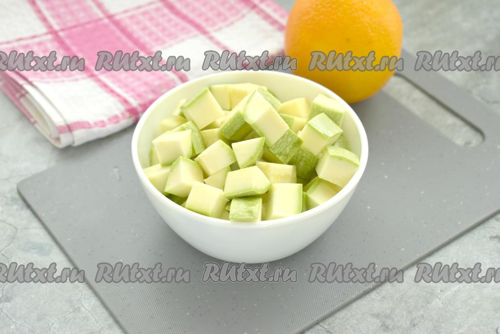 200 грамм подготовленного кабачка нарезаем на кубики со стороной 1-1,5 сантиметра.