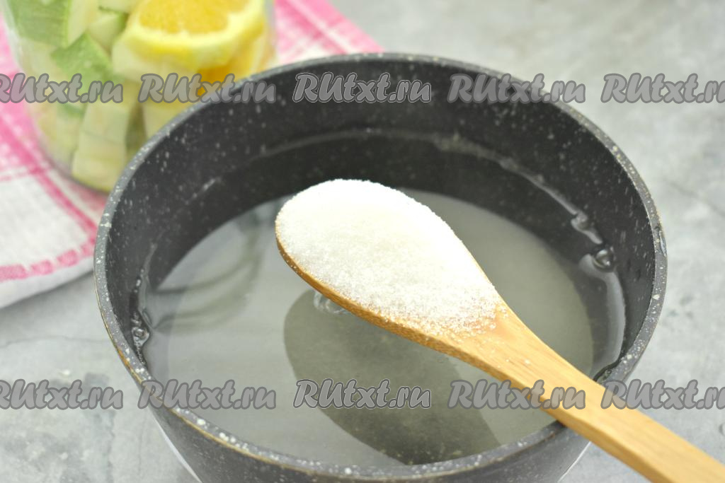 Через 15 минут воду из банки сливаем в кастрюльку, оставляя апельсины и кабачки в банке. Очень удобно сливать воду, надев на баночку капроновую крышку с отверстиями. Банку, после того как из неё слили воду, сразу прикрываем прокипячённой крышкой. В кастрюлю с водой, слитой из банки, всыпаем сахар, перемешиваем и на сильном огне доводим до кипения, затем провариваем сироп минуты 2 (до полного растворения сахара).