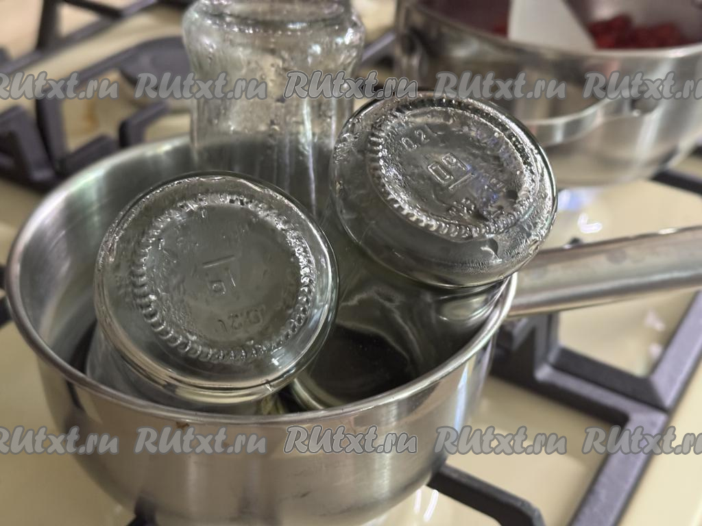 Пока варятся ягоды, нужно заняться банками. Банки (я взяла 4 банки объёмом по 200 миллилитров) нужно вымыть, простерилизовать любым удобным способом (я простерилизовала над паром в течение 5 минут), в этой же кастрюле прокипятила крышки в течение 5 минут с момента закипания воды.