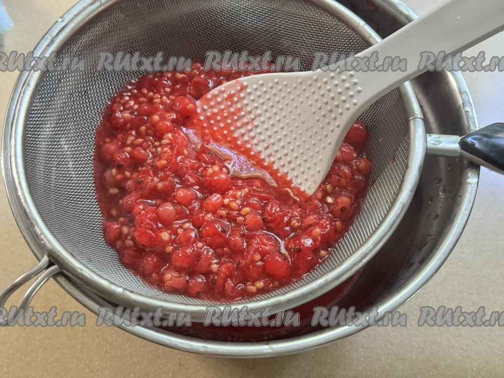 Взять миску, поверх неё поставить сито. Откинуть проваренную ягодную массу на сито и с помощью лопатки (или столовой ложки) перетереть смородину через сито в миску. В результате в миске будет пюре без косточек из красной смородины, а в сите останется практически сухой жмых с косточками (этот жмых нам не понадобится).