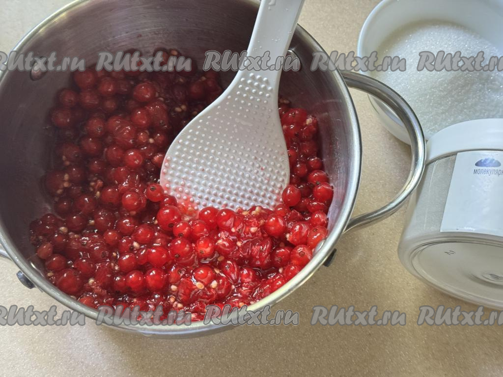 500 грамм подготовленной красной смородины выложить в кастрюлю с толстым дном, слегка помять ягоды лопаткой (или ложкой), поставить на средний огонь.